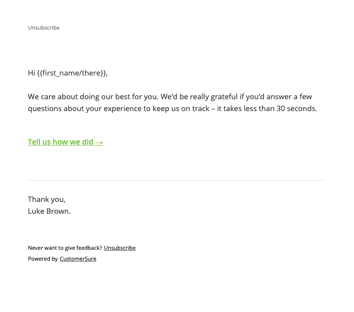 Anything else that’s stored against your feedback requests that doesn’t match a CustomerSure field or a segment can be used. For example if you have a column in a CSV file with the header ‘ticket_id’, you can use this column header as the variable name in your templates, e.g: